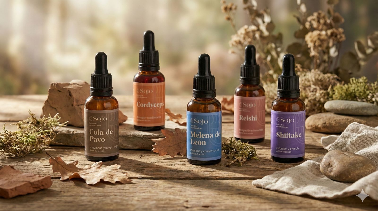 Las infusiones SOJO están pensadas como un ritual diario: se preparan con agua caliente y combinan hierbas y hongos para acompañar momentos específicos del día (energía, calma, digestión, enfoque).